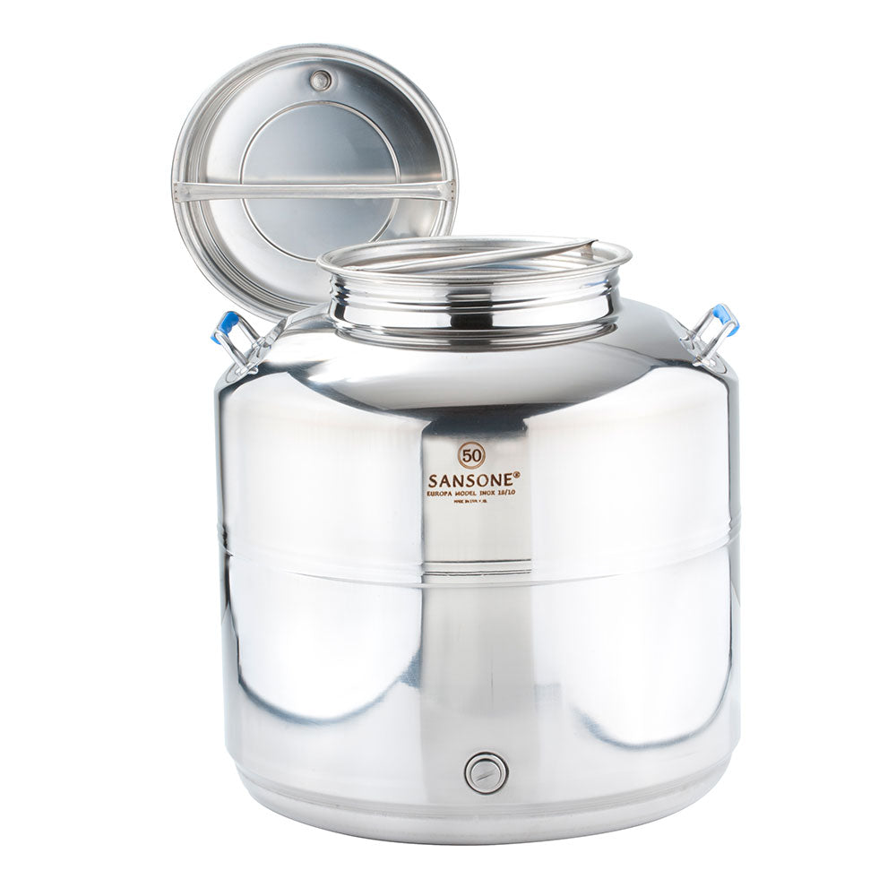 The Fustis we offer are the Europa style made in Italy by highly regarded La Nuova Sansone. They are of the finest craftsmanship with strong, high quality welding and attractive, shiny finish that will not rust. Sansone Fustis are made from grade of 18/10 - AISI 304 stainless steel, which can withstand the corrosive nature of acids found in vegetables, milk, and fruits. Type 304 is often used for pots and pans and cooking utensils. It is commonly used in dairy, brewing and distilling. The swivel valves (spigots) are made 18/10 - AISI 316 stainless which offers the highest level of protection from corrosion. Type 316 is used in many chemical industries as well as for surgical implants.