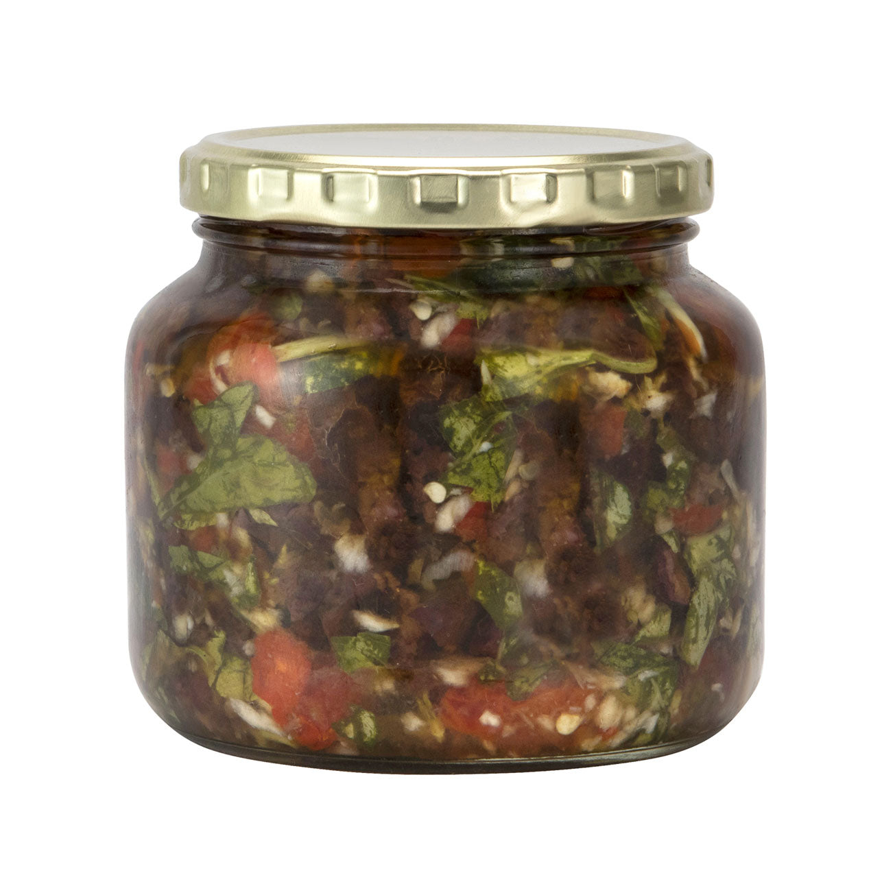 Sundried Pitted Mission Olives with sun dried tomatoes, fresh basil garlic and chilli